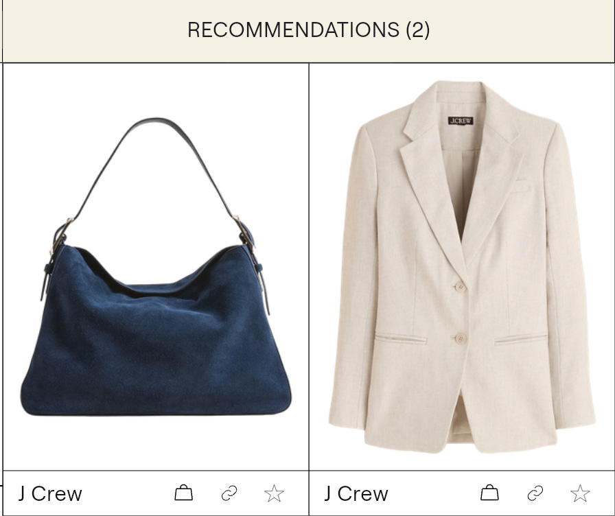 I also noticed on my scroll that my client didn’t have any lighter coloured accessories (everything was black) so enter stage left my second recommendation, this stunning blue suede bag, again from J Crew.