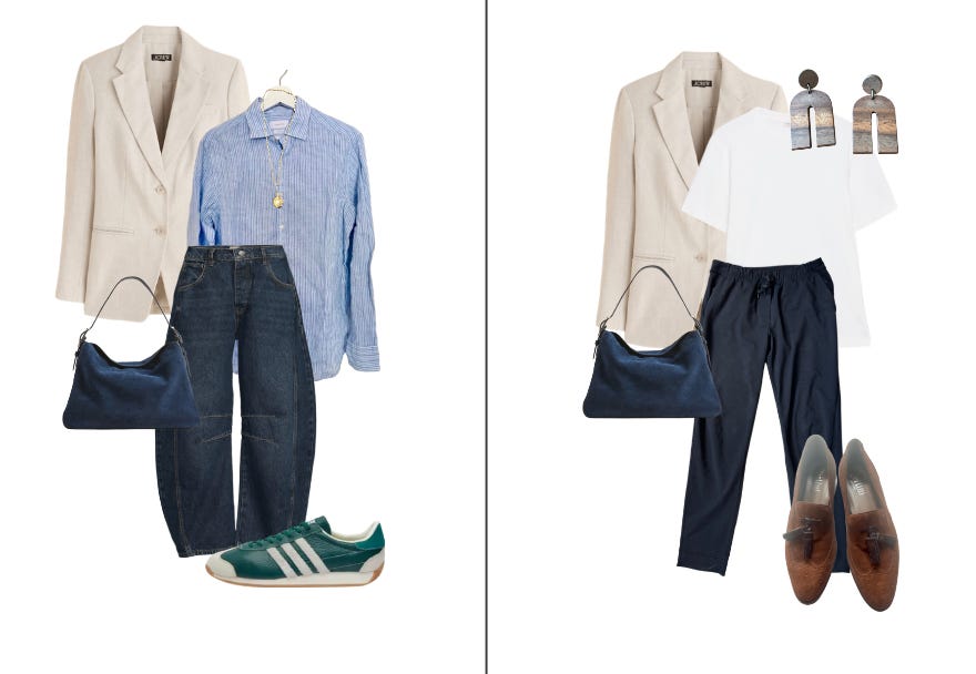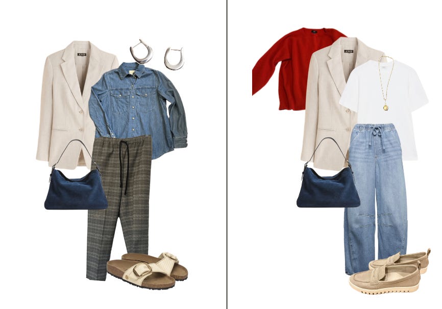 Lets put these two recommendations together with her existing pieces. As you can see on the left I paired the blazer with a linen stripe shirt that my client already had in her wardrobe, layered in a long necklace to break up the lines and suggested to my client to tuck the shirt entirely in to create a clean line at the waist. I then paired those pieces with her barrel leg jeans, comfortable sneakers and the suede tote recommendation to add texture.